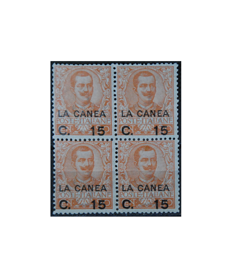 La Canea: 15 cent. su 20 cent. arancio in quartina. Nuovi, gomma integra.Anno: 1906