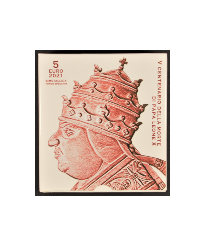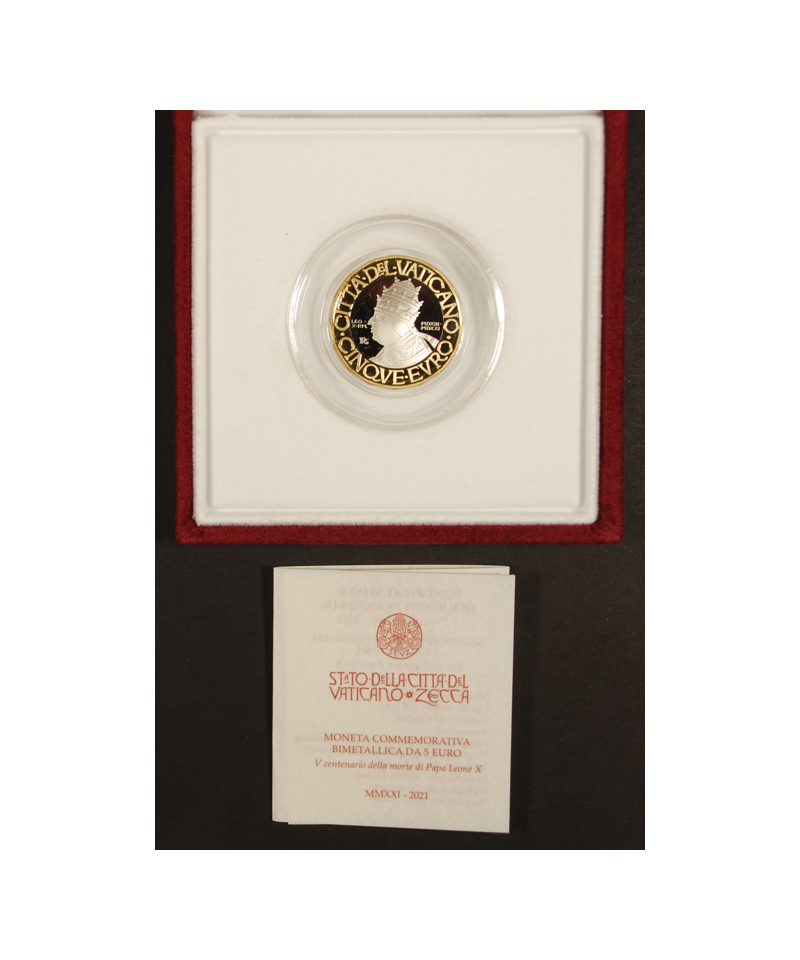 Città del Vaticano: 5€ bimetallico '500° della morte di Papa Leone X' Fondo Specchio, con cofanetto originale.